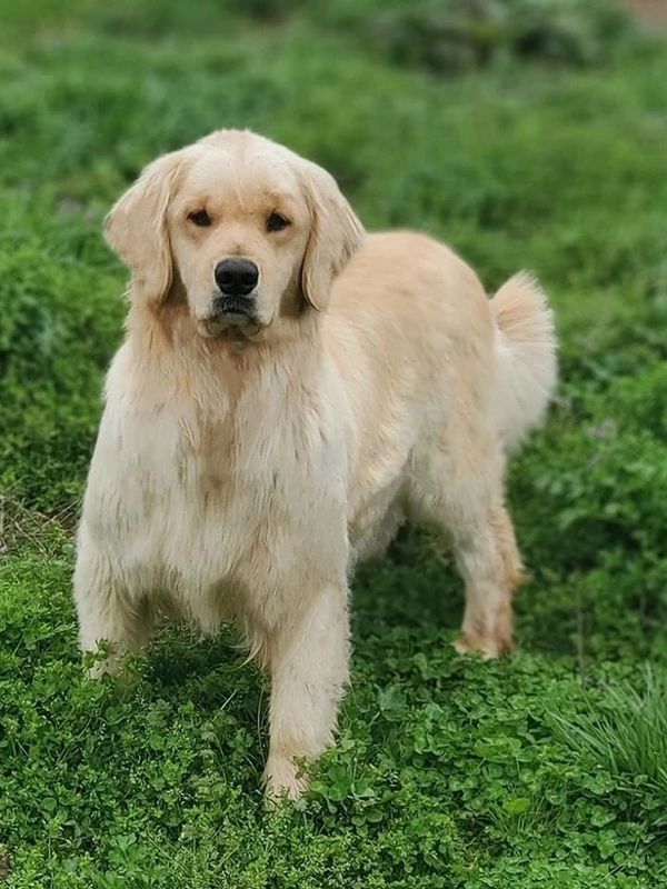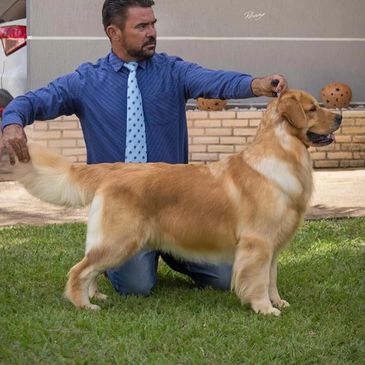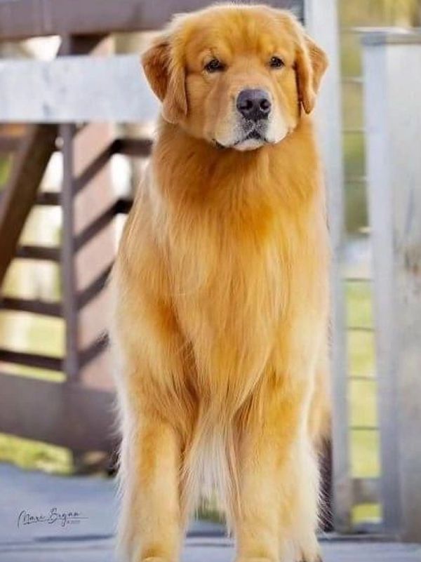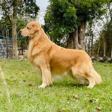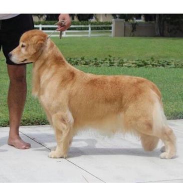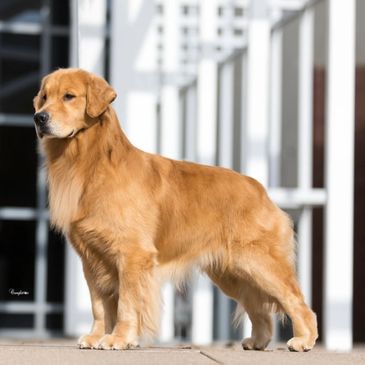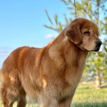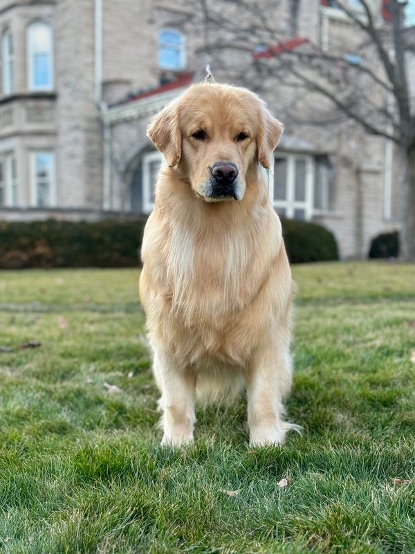 Quest is from an outside breeder from Brasilia, Brazil. She is such a fun girl. She lives for fetch and swimming. She is ALWAYS ready for an adventure, and very attentive to humans. It’s almost as if she can speak to you with those big brown eyes of hers! She is a big, light colored golden, with a blocky head, and a very breed correct water-repellent, easy-to-maintain coat. Quest has produced several service and therapy dogs. She is such an intelligent girl, and has consistently passed these qualities on to her offspring.